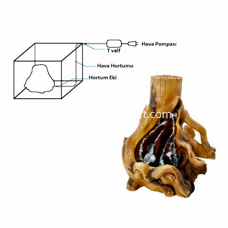 Hava motoru yardımıyla içerisinde bulunan ince taneli kumları, üzerinde bulunan kanallardan geçirerek sürekli sirkülasyon yaparak seyir keyfinizi arttıracak aynı zamanda akvaryumunuza estetik kazandıracak ağaç kökü biçiminde kum şelalesi.