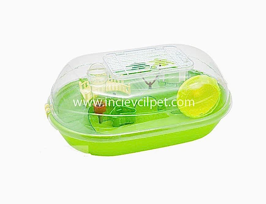 hamster kafesi, yuvası, çarkı ve haster suluğu gibi aksesuarları olan, hamsterlar ve küçük kemirgenler için, üst kısmı şeffaf akrilikten yapılmış, hamster kafesidir.