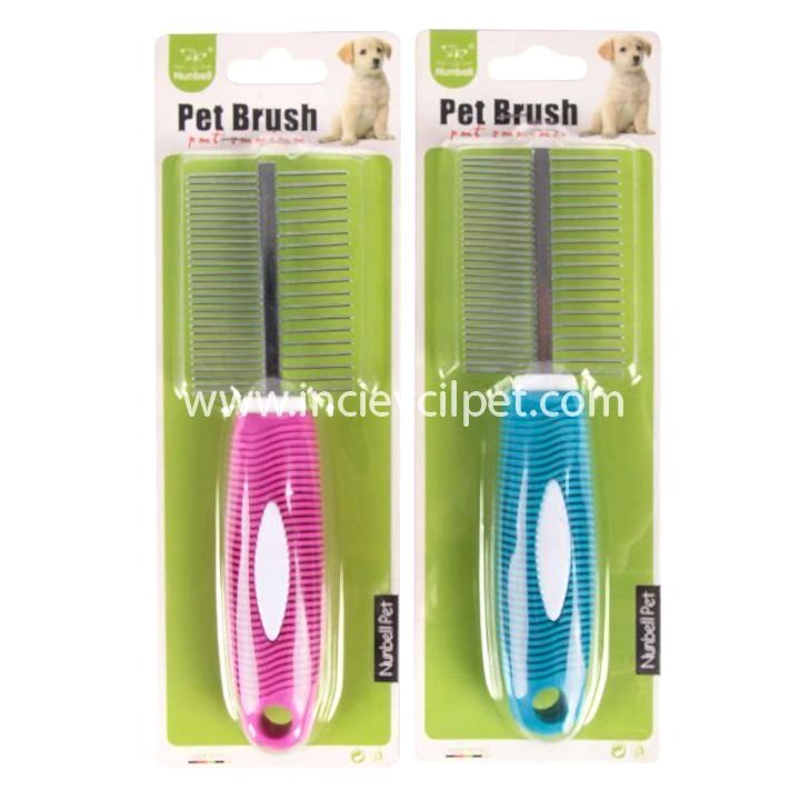 Evcil hayvanların topaklaşan (kıtıklarsan) normal fırçalarla taranamayacak şekilde birbirine karışmış olan tüylerini açmada kullanılmak için özel olarak tasarlanmış, ergonomik saplı, farklı kalınlıklarda tellerden oluşan Nunbell çift taraflı tüy açma tarağı.