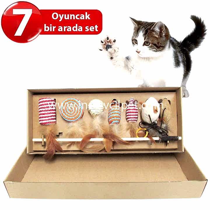 Kediler için kedi oltası, hasır peluş fareler ve hasır tüylü toplardan oluşan toplam 7 parça kedi oyuncağına sahip Nunbell Hasır Kedi Oyuncağı Seti.